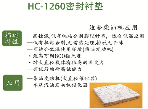 描述特性:高性能,低有機(jī)粘合劑膨脹襯墊,適合低溫應(yīng)用;低有機(jī)粘合劑,無需熱處理,排放無異味;可適合低溫使用環(huán)境(柴油發(fā)動(dòng)機(jī));最高可到800攝氏度;對(duì)大直徑載體有很高的固定力;有極好的耐腐蝕能力